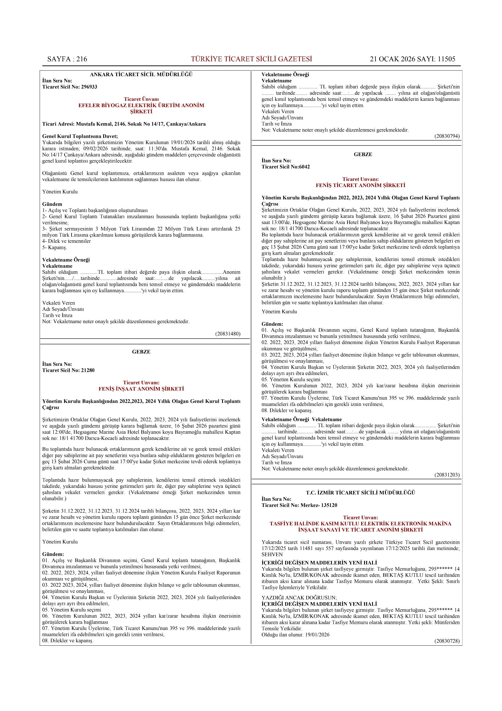 İlgili duyuru Türkiye Ticaret Sicili Gazetesi'nin 13 Ocak 2026 tarih ile 11499 ve 21 Ocak 2026 tarih ve 11505 sayılı nüshasında yayınlanmıştır.